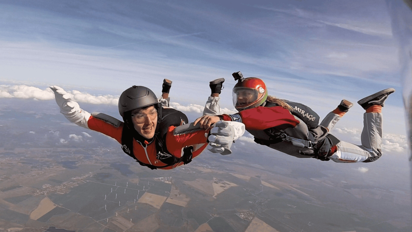 Ab jetzt nur noch ein Sprunglehrer. Der Lehrer lässt den AFF-Schüler los und legt sich ihm gegenüber. Erste 360° Drehungen einleiten und selbstständig stoppen.