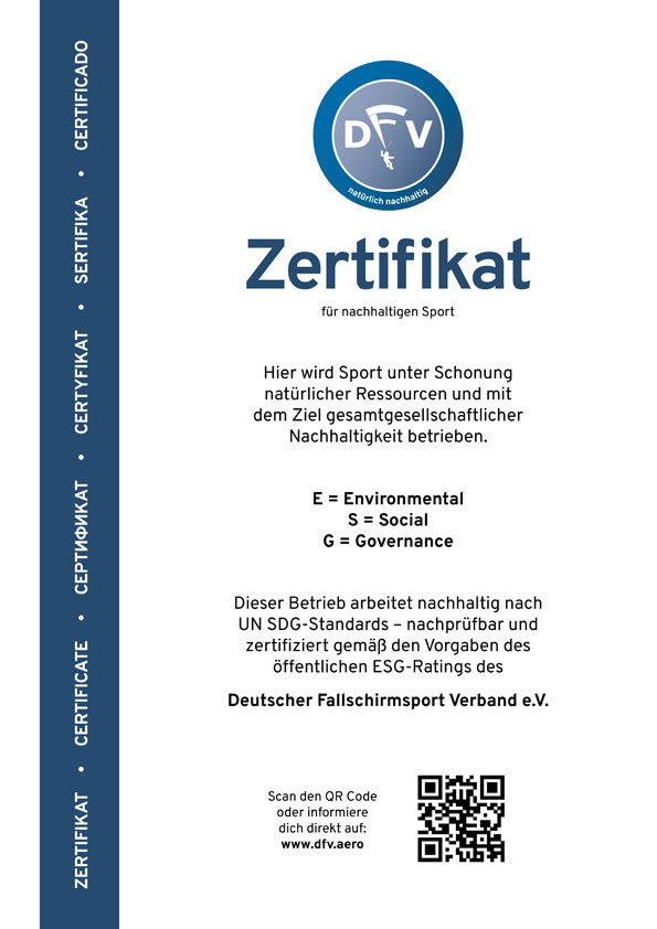 ESG-Management braucht mit wissenschaftlicher Kompetenz für die jeweilige Anwendungsumgebung definierte Maßstäbe, denn z.B. ein Textilhändler funktioniert anders als ein Fallschirmsprungbetrieb. Darum wurde der DFV-ESG-Kriterienkatalog von einer externen ESG-Expertin mit dem fallschirmsportlichen Input des DFV-ESG-Referats nach international anerkannten Standards erarbeitet und zahlt auf die UN Sustainable Development Goals (UN SDG) ein. Der Kriterienkatalog ist wie auch die gesamte Bewertung auf der Website des DFV veröffentlicht.